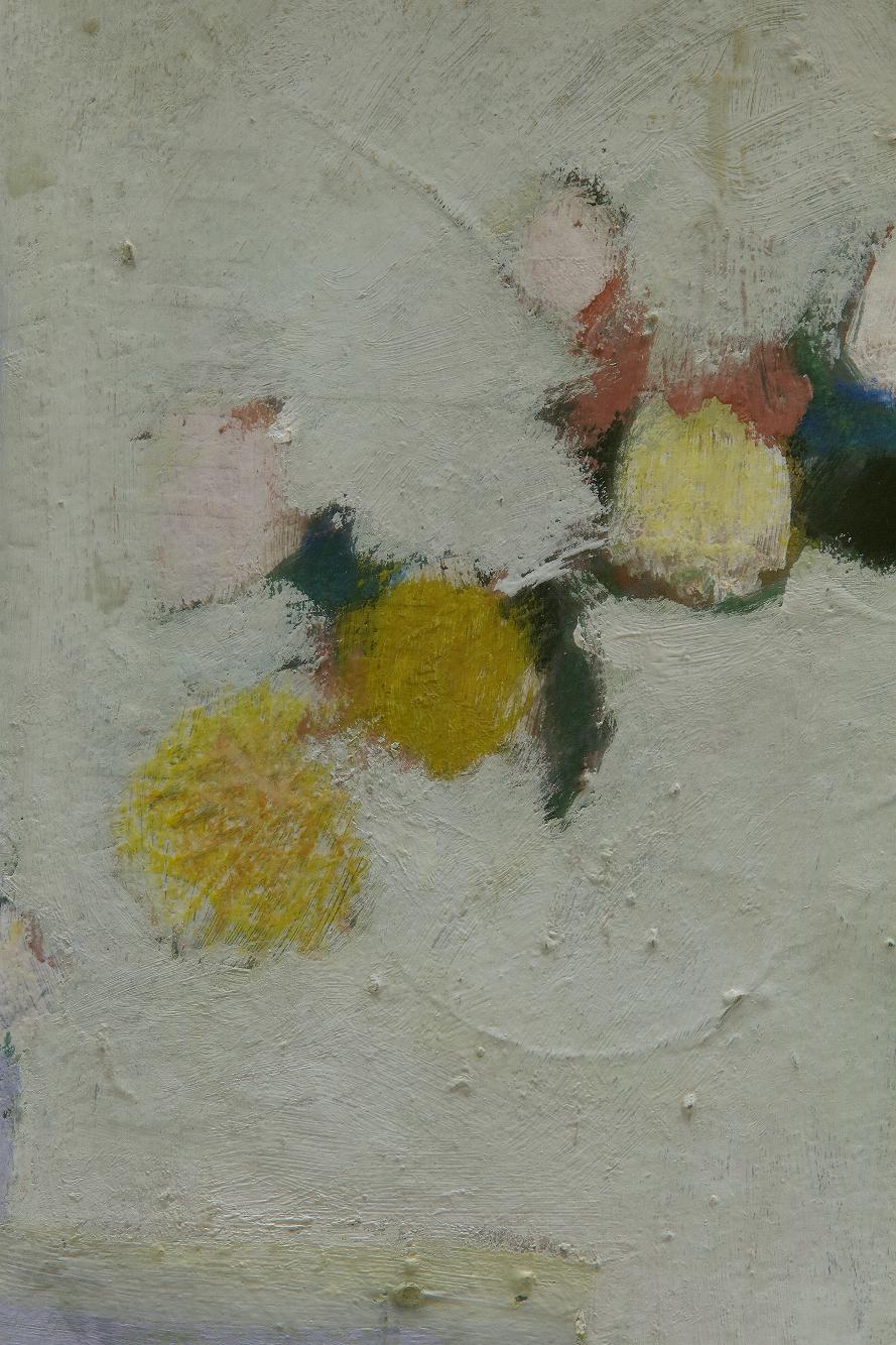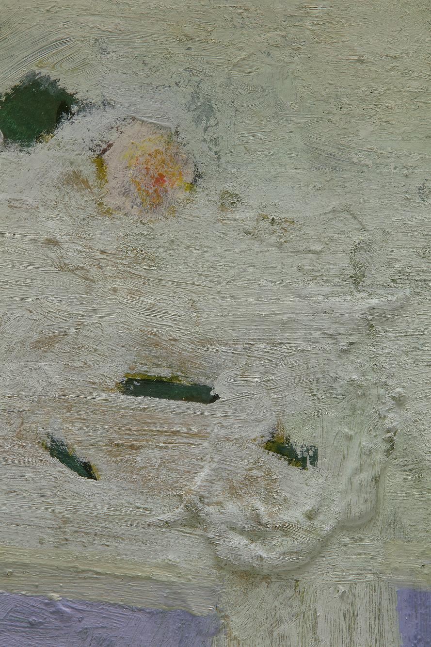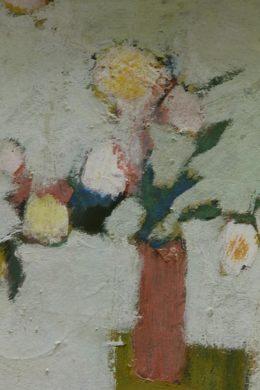 Außer den Landschaften in zarten Oliv- und Blaugrautönen, sparsam durchsetzt von Erdtönen, gibt es auch Blumenstillleben von Andoks. Nur selten sind sie mittig platziert, stehen seitlich, drohen mitunter von ihrer Unterlage zu stürzen. Mal liegen überreife Samenkörner, mal welkende Blütenblätter auf dem Tisch; jede Pflanze ist in ihrem Werden und Vergehen porträtiert.