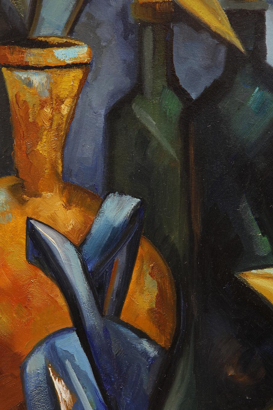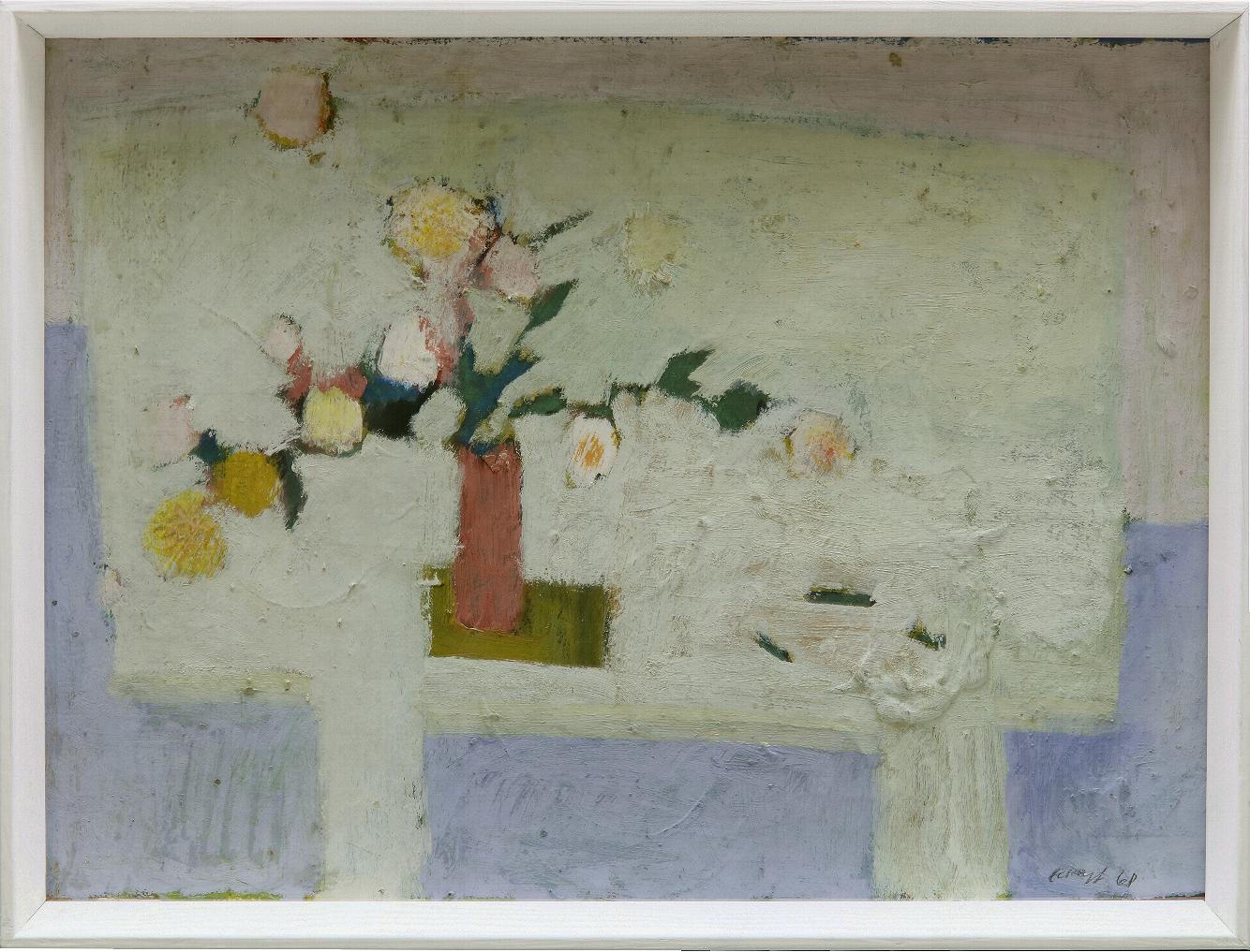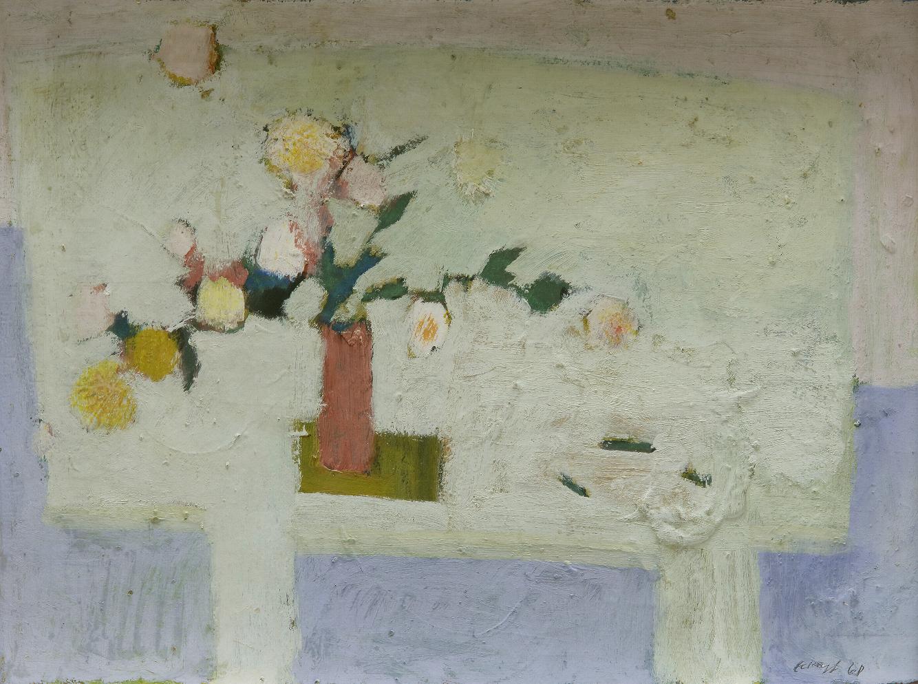 Außer den Landschaften in zarten Oliv- und Blaugrautönen, sparsam durchsetzt von Erdtönen, gibt es auch Blumenstillleben von Andoks. Nur selten sind sie mittig platziert, stehen seitlich, drohen mitunter von ihrer Unterlage zu stürzen. Mal liegen überreife Samenkörner, mal welkende Blütenblätter auf dem Tisch; jede Pflanze ist in ihrem Werden und Vergehen porträtiert.