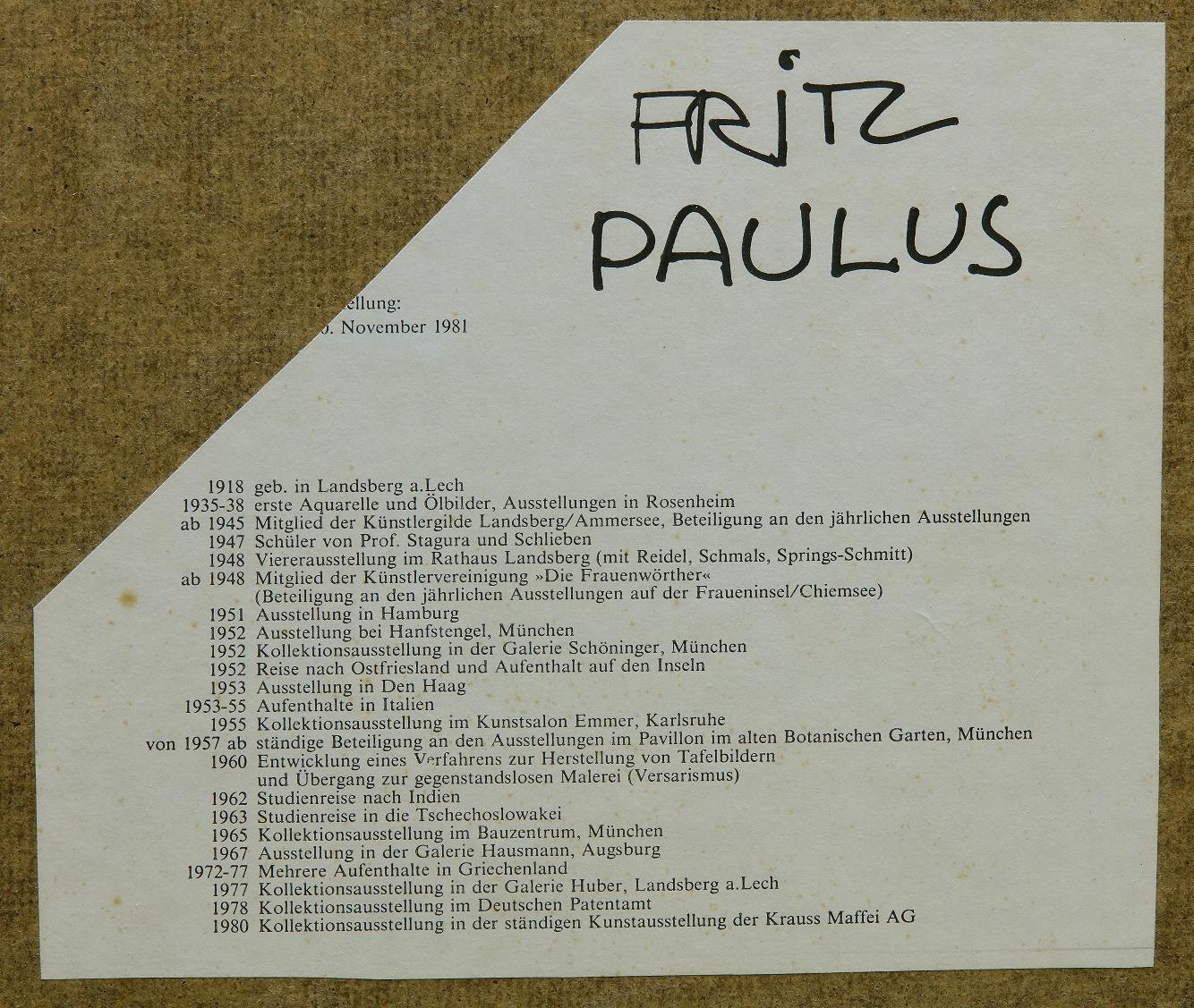 Erste Aquarelle und Ölbilder von Fritz Paulus entstanden zwischen 1935 und 1938, die in Rosenheim ausgestellt wurden. Ab 1945 wurde er Mitglied der Künstlergilde Landsberg/Ammersee und beteiligte sich an den jährlichen Ausstellungen. Im Jahr 1947 war Paulus Schüler von Prof. Albert Stagura (1866–1947) und Ludwig von Schlieben.